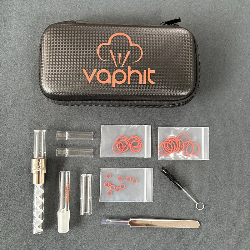 The Vaphit QOQ features an all quartz bowl and cap. Featuring no metal touching your material, the QOQ provide the best flavor experience yet! The two titanium collars offer ease of disassembly and cleaning. The larger collar is secured using two large O-rings which the heating cap press fits into, while the smaller collar secures the glass helix mouthpiece in the same way. The 14mm WPA (Water Pipe Adapter) can be used instead of the helix mouthpiece to use with any 14mm female joint water piece.